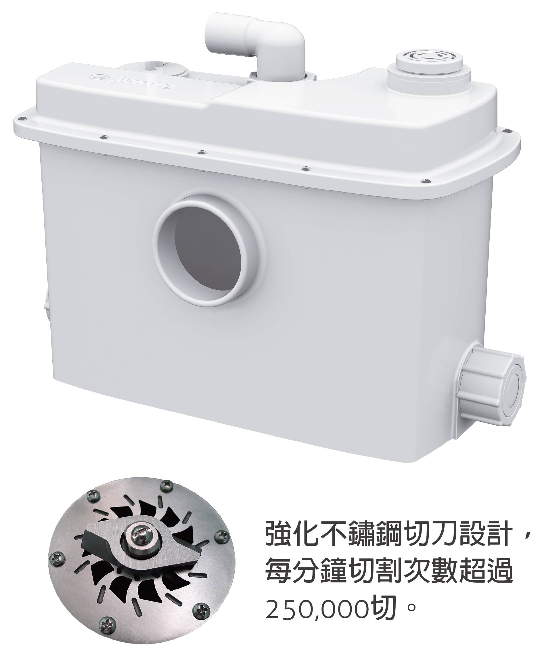 •為家用馬桶、洗臉台、浴缸、淋浴間整體排污設計。 •適用於辦公室、 住宅地下室、停車場、套房、倉庫、加蓋房間等的浴廁改建、增建。 •不需要破壞牆面、地板,施工範圍最小,影響最小。 • 節省增建、改建成本及時間。 •可調整方向的活接設計,使出水可排向任何方向。 •202型後排式馬桶組,通過美國ADA認證 ,整組配裝節省安裝時間。 •可安裝於馬桶後方或隱藏於牆後(需延長後排管長度)。 •1英吋出口口徑,可配合實際管路降至3/4英吋。 •1-1/2英吋通氣管口,便利台灣使用環境可選配專用通氣閥。 •單次沖水6公升。 •可承受環境最高溫度 : 40°C。 •停止水位95mm,啟動水位114mm。 •1/2馬力磨碎型泵浦。 •標準垂直連桿式自動浮球開關。 •熱過載保護馬達,可延長產品壽命。 •不鏽鋼螺絲、螺栓及提把。 •無阻塞渦流式葉輪。 •上下滾珠軸承運轉含油潤滑。 •陶瓷/碳精機械軸封。 •本提升器中之泵浦為專用設計,切勿單獨用於其他場所。 •耐用ABS材質,白色外觀。 •質地輕巧。 •出水口內建式止回閥。 •桶身內置入水口止回閥,可接1英吋管。 • 可選配入水口止回閥及活動螺母,便於維修